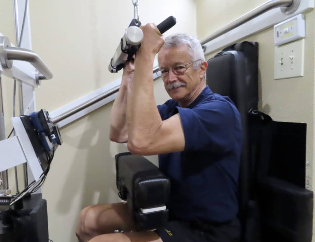 Trace has developed a Static method that avoids injury, which is particularly important  as one ages but still permits one to become measurably stronger. I also like it that I only  have to go once a week to work out and that it only takes about 30 minutes to complete  my exercise session.